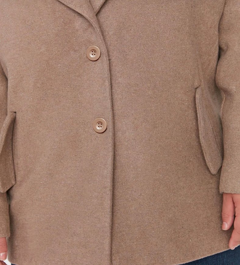 Bej süet kumaştan, düğmeli ve kesik yaka detaylı hamile kabanı. Normal kesim, uzun kollu ve midi boyda, ofis için uygun.
