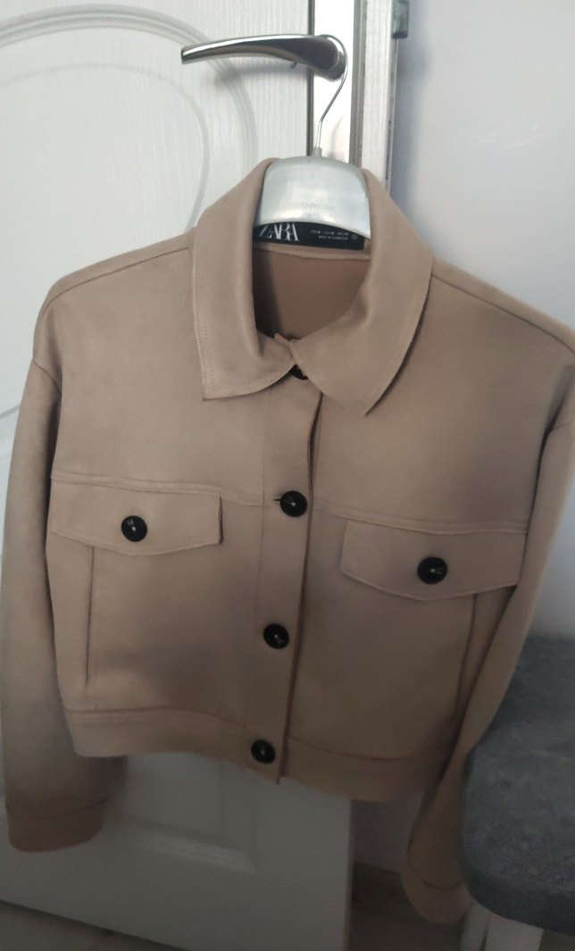 Bej süet kadın ceketi, düğmeli ön, kesik yaka ve uzun kolludur. Rahat kesim ve kısa boyuyla günlük sokak stiline uygundur. Desensizdir ve gündelik kullanıma uygundur.