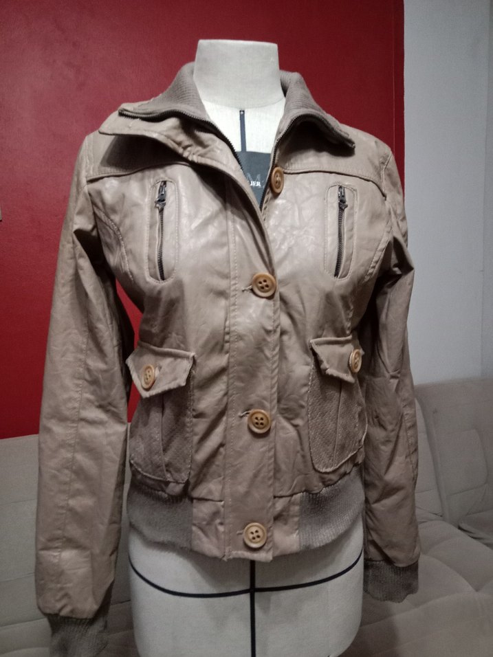 Düğmeli, bej renkli, kısa kesim, fitted deri ceket. Uzun kollu, çıtçıtlı cepler ve yakası notched lapel tarzında, sokak modasına uygun.