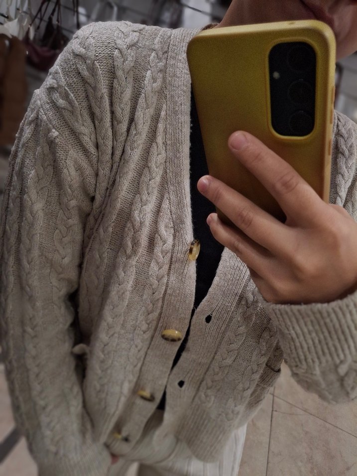 Düğmeli bej triko hırka, uzun kollu, normal uzunlukta ve fitted kesimlidir. Notlu yaka ve desen içermeyen dokusu ile günlük kullanıma uygundur.