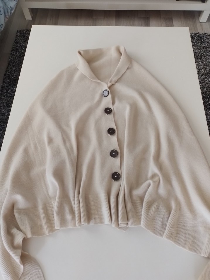 Düğmeli, bej renk uzun triko panco, Yumuşak triko dokusu rahat ve şık bir görünüm sunar.