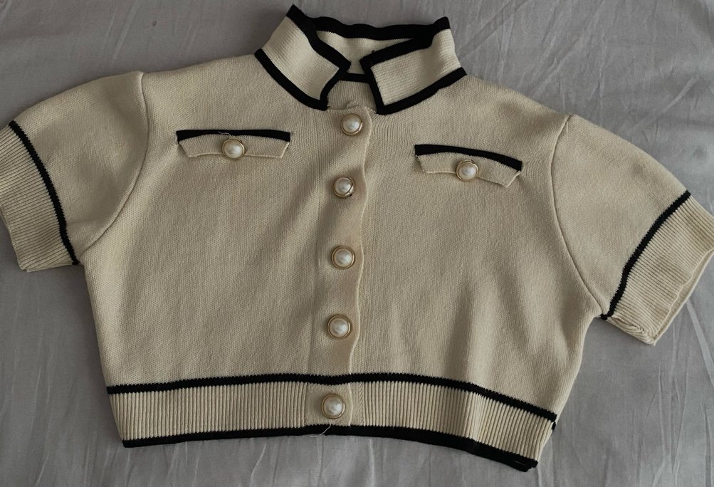 Düğmeli, yakalı ve inci düğmeli bej triko hırka, siyah detaylarla modern klasik tarz sunar. Günlük kullanıma uygundur. Marka temsili yazıldı çok iyi durumda