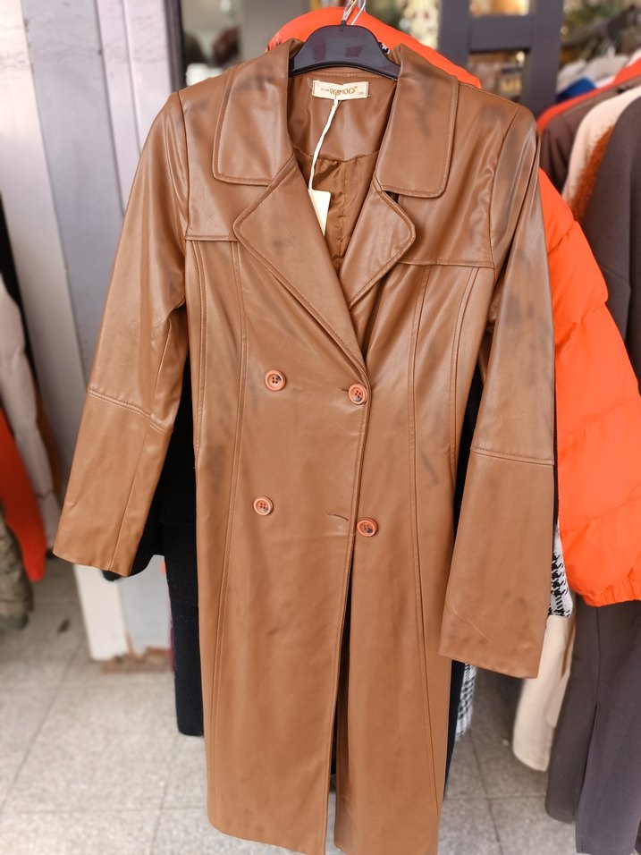 Düğmeli, uzun ve dar kesim kadın deri ceket. Parlak bej renkte, açık yakalı ve uzun kolludur. Günlük kullanıma uygundur.