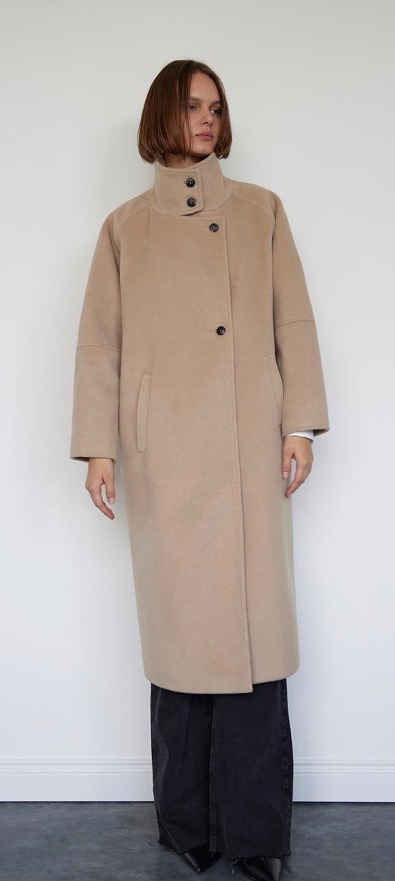 Bej renkli uzun kaban, yüksek yakalı ve düğmeli ön kapama detayına sahiptir. Yan ceplidir ve sade şık bir görünüm sunar. İç astar kısmında 7-8 cm’lik sökük mevcut.