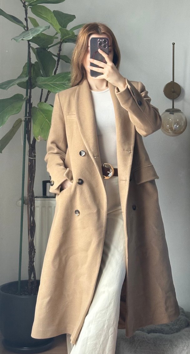 Düğmeli Bej Uzun Kaban
