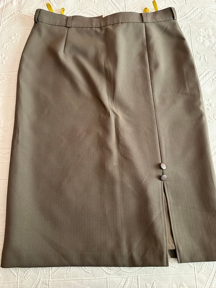 Düğmeli detaylı, uzun bej kadın eteği, ipeksi kumaştan ve normal kesimlidir. Ofis için uygun, sade ve temel bir tarza sahiptir.