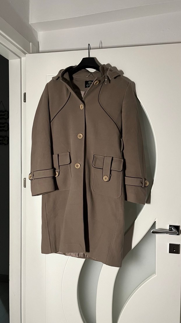 Bej renkli, uzun boy kadın kaban, düğmeli ve kesik yaka detaylıdır. Uzun kollu, cepli ve rahat kesimdir. Yumuşak ve sıcak dokulu kumaştan üretilmiştir.