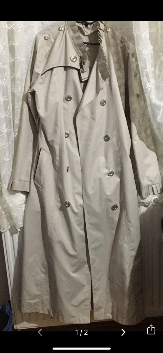 Düğmeli ön kısmı ve kırmalı yakasıyla bej uzun trençkot, sentetik kumaştan ve bol kesimdir. Sokak modasına uygun, günlük kullanıma ideal Paris tarzı.