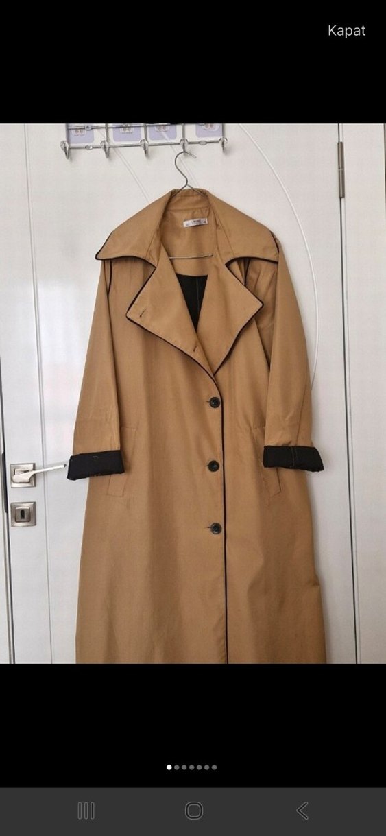 Bej renkli uzun trençkot, düğmeli ve kesik yaka detaylıdır. Uzun kollu, siyah manşetli ve sentetik kumaştandır. Günlük rahat sokak stili için uygundur.