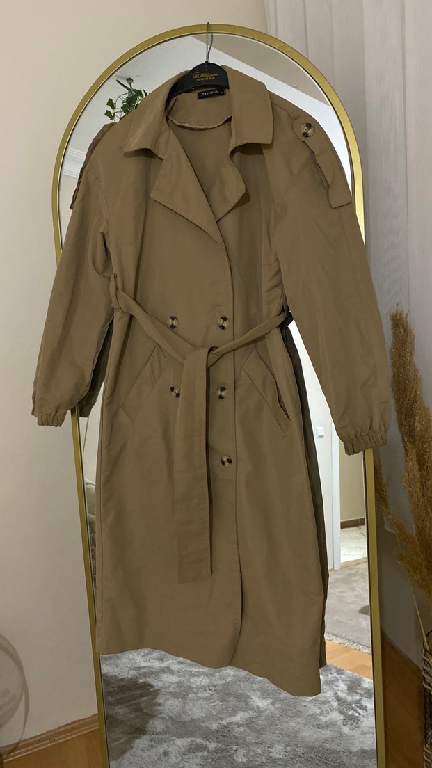 Bej renkli, uzun kesim kadın trençkot, düğmeli ve kuşaklıdır. Sentetik kumaştan üretilmiş, notched yaka ve elastik manşetli uzun kolludur. Rahat ve salaş kesimdir.