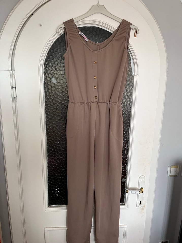 Düğmeli Bej Uzun Kadın Tulum