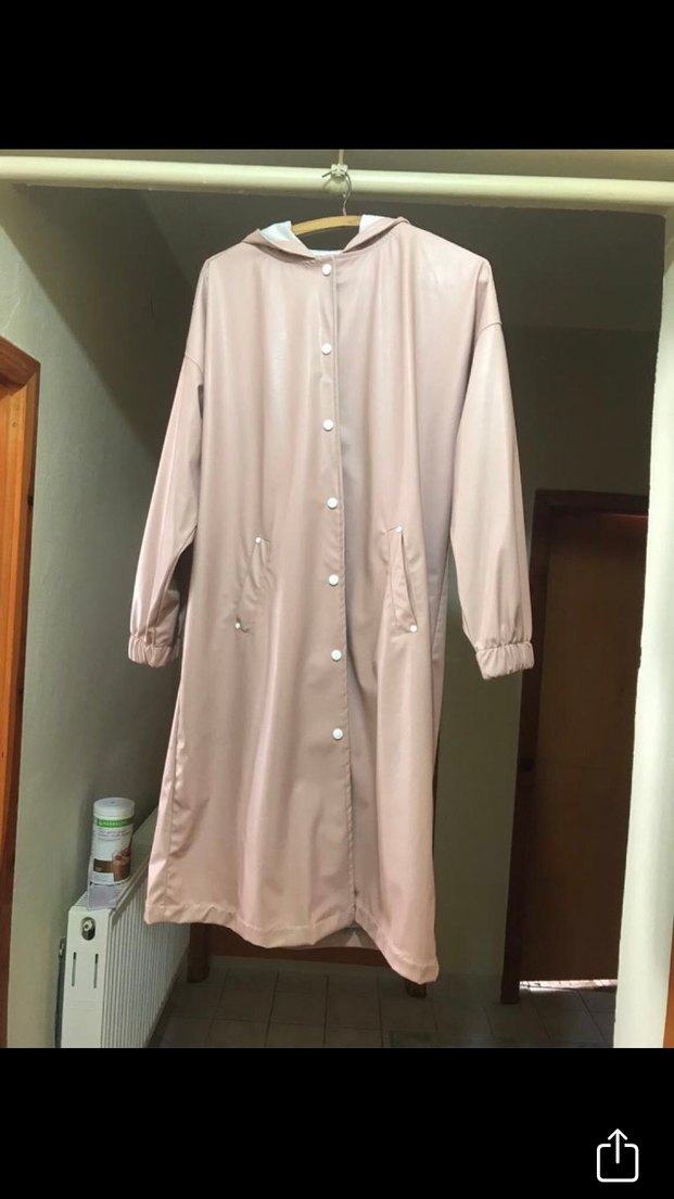 Düğmeli, uzun kesim bej kadın yağmurluk, bol kesim ve uzun kolludur. Minimalist tasarımlı, yakalı ve cepli, günlük sokak stiline uygundur. Sentetik kumaştan, pastel renkte ve rahat bir üründür. ☔