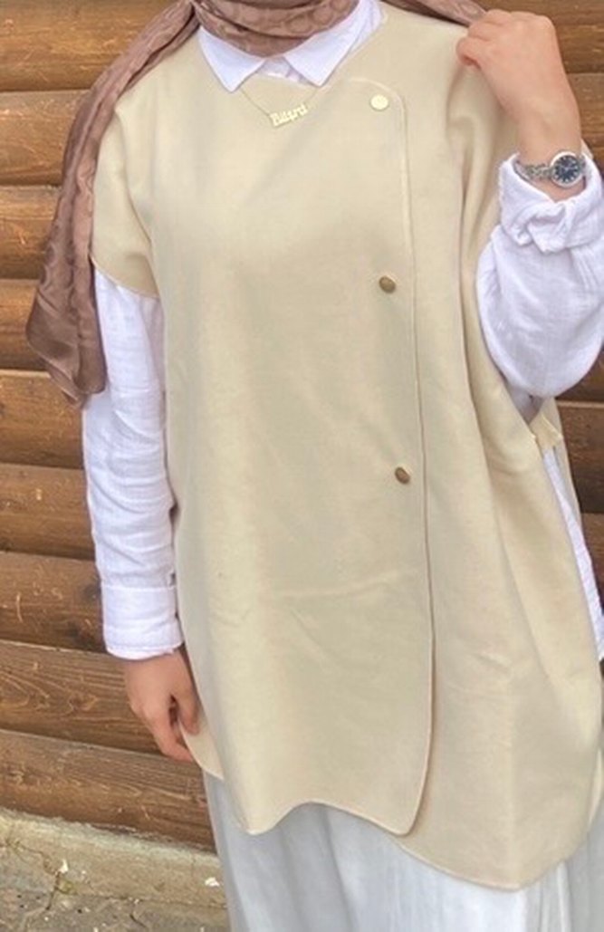 Düğmeli önü ve kesik yakası olan bej uzun kolye, yumuşak sentetik kumaştan. Rahat kesimiyle trend sokak stili için uygun.