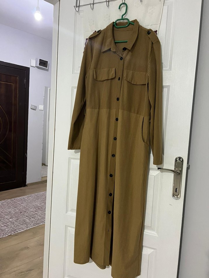 Bej renkli uzun keten elbise, düğmeli ön ve kesik yaka detayına sahiptir. Uzun kollu, rahat kesim ve minimalist tarzda günlük kullanıma uygundur.