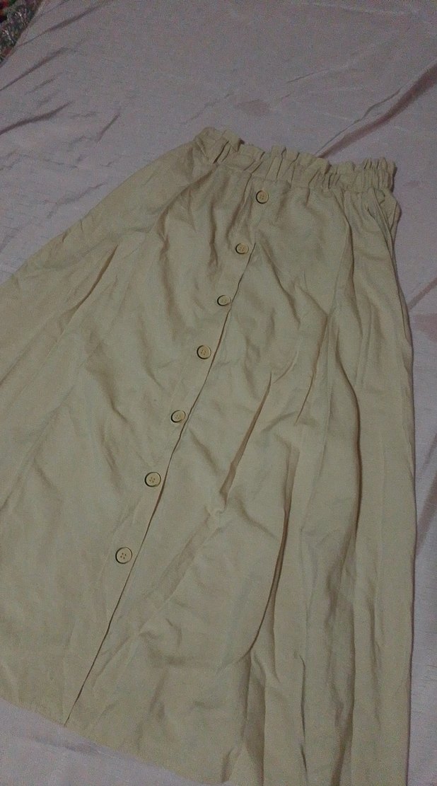 Yumuşak keten kumaştan, düğmeli, bol kesim, pastel bej renkte uzun etek, minimalist bohem tarzda. acık renk olduğu için astarla giyilebilir