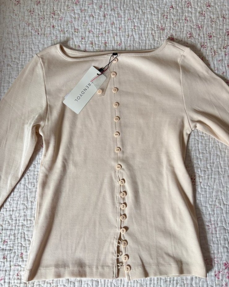 Düğmeli ön kısmı, uzun kollu ve yuvarlak yakalı, pamuklu bej renkli kadın tişörtü. Normal boyda ve fitted kesim, günlük kullanıma uygun. Pastel tonlarıyla Paris tarzı normcore görünüm sunar.
