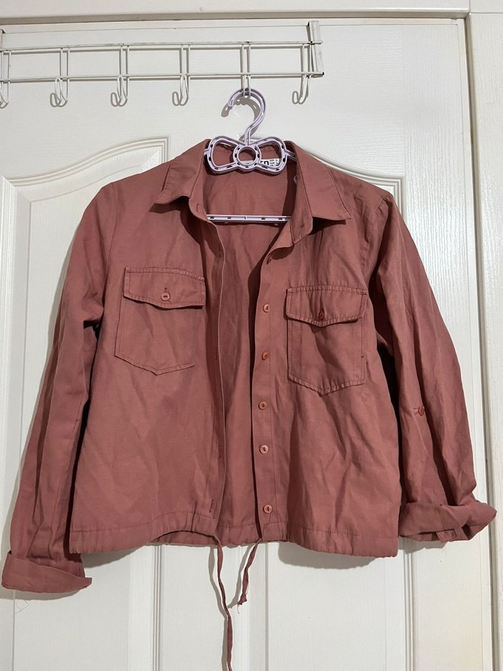 Bu bej keten gömlek, düğmeli ön, uzun kollu ve notlu yaka detayına sahip, rahat kesimiyle günlük sokak stiline uygundur. Beli büzgü ve bağlama detaylıdır.