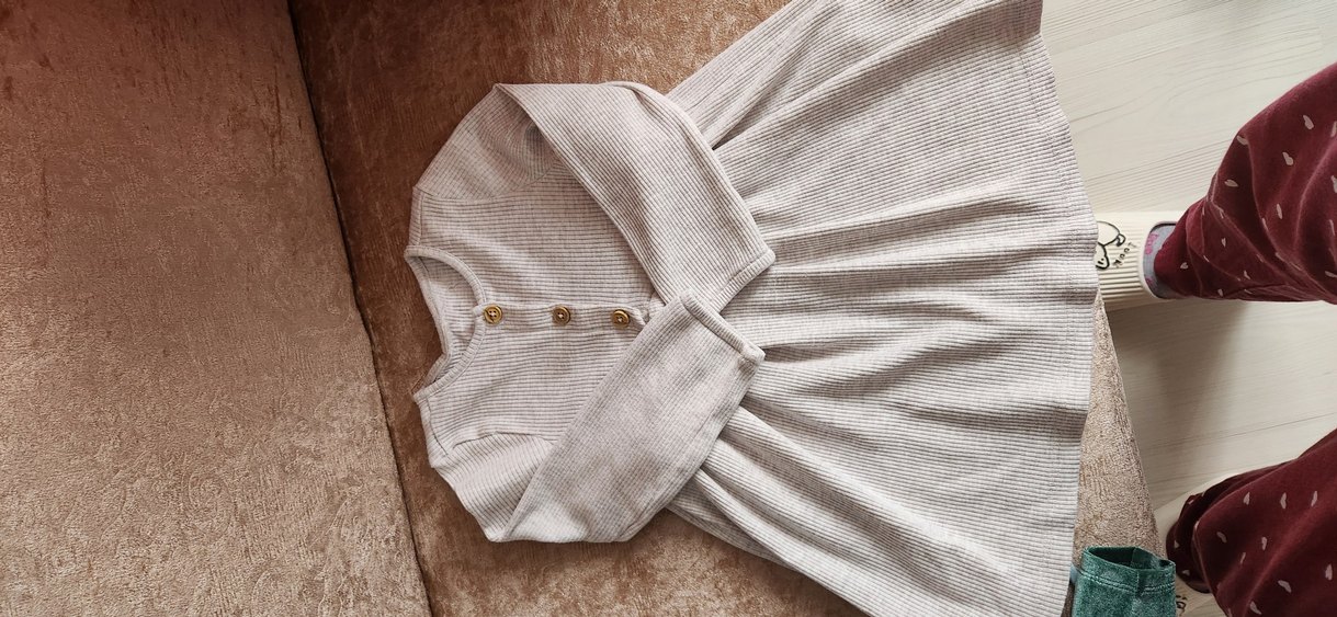 Yumuşak keten kumaştan, düğmeli ve yakası kesik detaylı bej uzun kollu triko elbise. Rahat kesimi ve desensiz tasarımıyla günlük kullanıma uygundur.