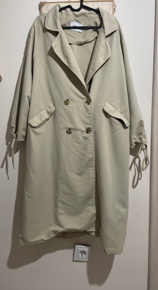 Düğmeli kapamalı, yakalı ve askılı kollu bej uzun trençkot. Rahat kesim ve yumuşak sentetik kumaştan, gündelik sokak tarzı için uygun. Kol altında ufak bir kusuru var ufak bir terzi işlemiyle tertemiz olur kumaşı çok kaliteli.
