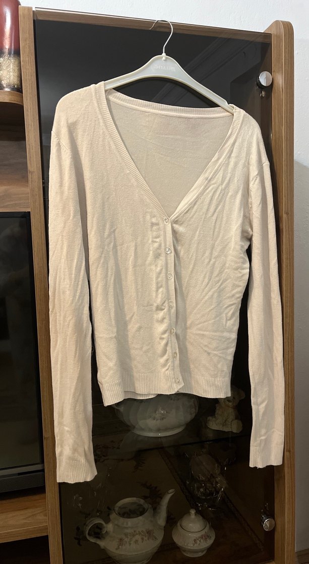 Pamuk kumaştan, uzun kollu ve düğmeli beyaz hırka. V yaka ve rahat kesimiyle günlük sokak stili için uygundur.