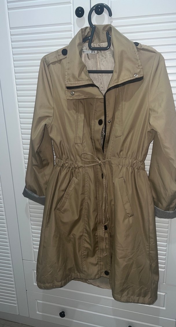 Düğmeli kapamalı, bej midi yağmurluk. Sentetik kumaştan, strappy kollu ve belden ayarlanabilir bağcıklı. Günlük sokak stili için uygun. ☔