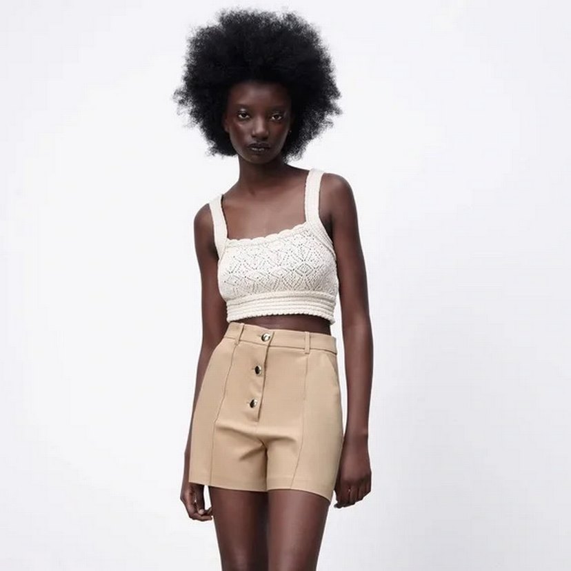 Düğmeli, bej renkli yüksek bel kadın şortlar, kısa boy ve normal kesime sahiptir. Triko kumaştan üretilmiş olup günlük kullanım için uygundur.