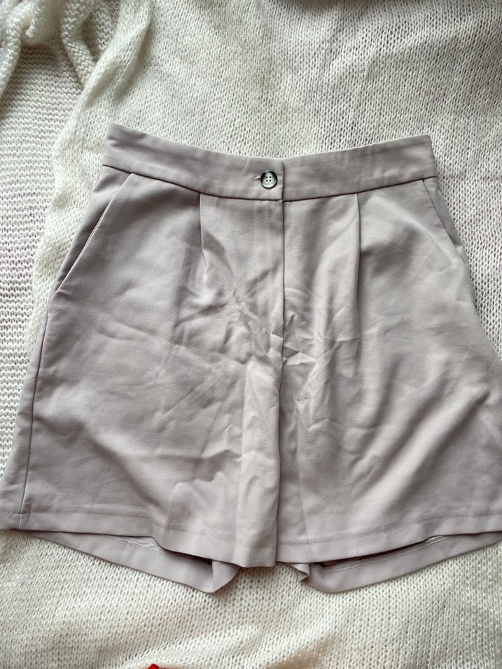 Düğmeli, yüksek bel bej şort, yumuşak sentetik kumaştan ve bol kesimlidir. Minimalist, rahat tarz için uygundur. Dize yakın boyu kısa değil
