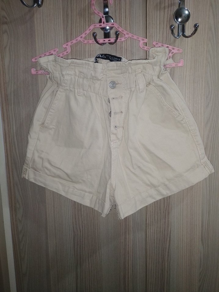 Düğmeli, pamuklu, bej renkli yüksek bel mini şort. Rahat ve bol kesim, günlük sokak stili için uygundur.