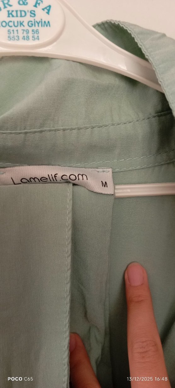 Düğmeli, notched lapel yakalı, uzun kollu, pastel yeşil renkli, Rahat kesim ve ipeksi kumaştan üretilmiştir. Marka: Lamelif.