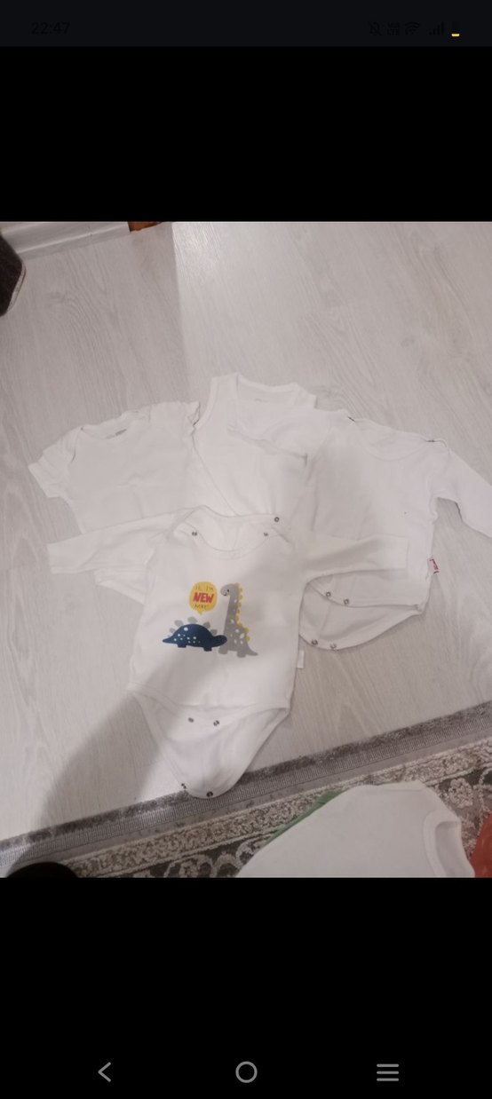 Düğmeli, kısa kollu, beyaz bebek body, yumuşak ve sıcak kumaştan yapılmıştır. Bir tanesinde sevimli dinozor baskısı vardır. 3-6 ay görselde minik defolar belirttim