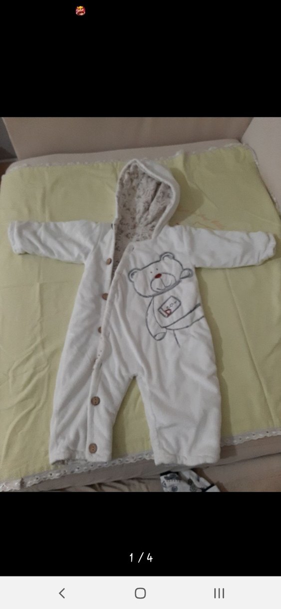 Düğmeli, kapüşonlu beyaz bebek tulumu, gri ayı desenli ve yuvarlak yakalıdır.