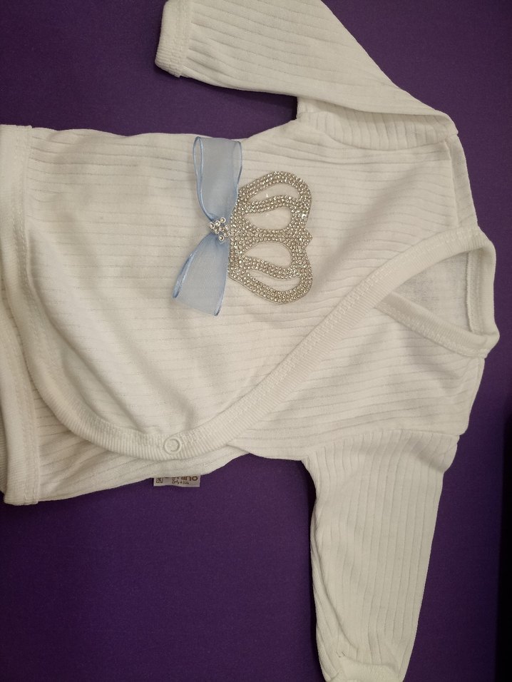 Uzun kollu, düğmeli beyaz örme bebek hastane kıyafeti. Yumuşak dokulu, pastel renkli kurdele ve taç süslemeli, yenidoğanlar için uygun.