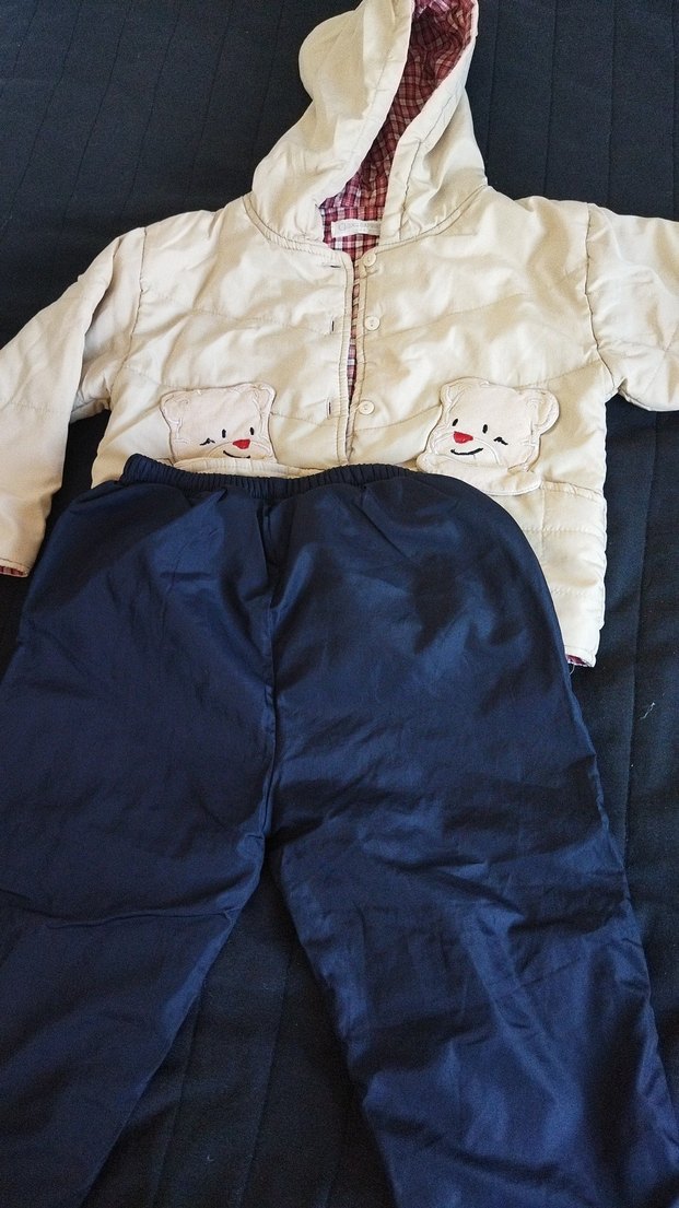 4 yaş Düğmeli beyaz ceket ve ayı yüzü detaylı, koyu lacivert pantolonlu, yumuşak ve sıcak fleece kumaştan yapılmış bebek kayak tulumu. ❄️