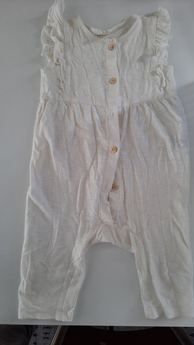 Düğmeli, sade desensiz beyaz bebek kız tulumu, yumuşak kumaştan üretilmiştir. Hafif tüylenmesi var.