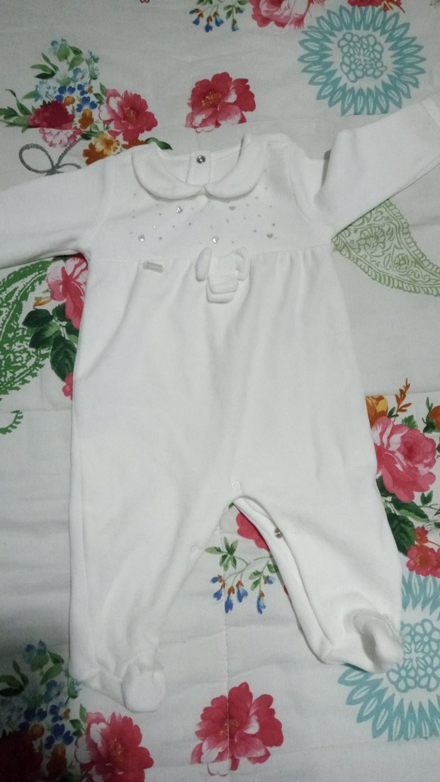 Düğmeli, beyaz renkli bebek kız tulumu. Yumuşak kumaş ve sade, desensiz tasarıma sahiptir. Küçük süslemeler ve sevimli yakası vardır.