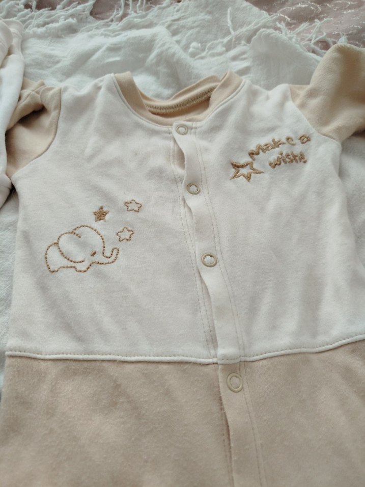 Düğmeli, uzun kollu beyaz bebek tulumu, nakışlı yıldız ve fil desenleriyle. Yuvarlak yaka ve düğmeli kapama bulunur.