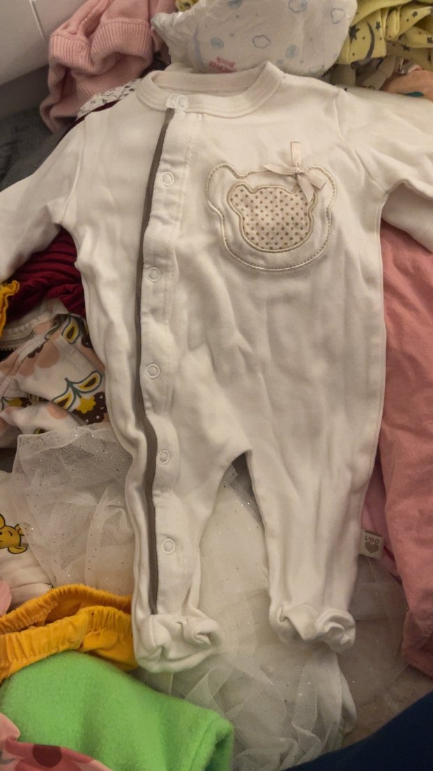Düğmeli ve uzun kollu beyaz bebek tulumu, yumuşak sentetik kumaştan üretilmiş. Göğsünde ayıcık işlemeli detay bulunur .
