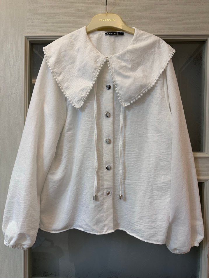 Beyaz , uzun kollu, büyük yakalı, düğmeli ve yaka bağlama detaylara sahip bohem tarzda günlük kullanıma uygun salaş kadın gömlek. 40 ve 42 bedene de olur dar kalıp çünkü