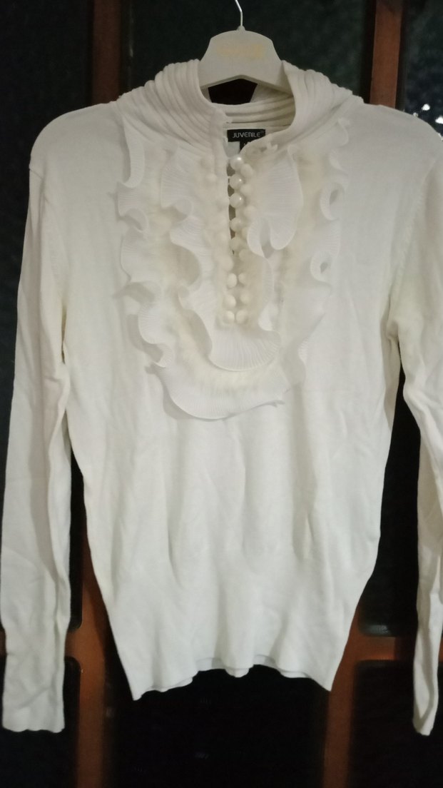 Düğmeli ve fırfırlı detaylara sahip, ince örme kumaştan yapılmış beyaz, uzun kollu, bohem tarzda kadın kazak.