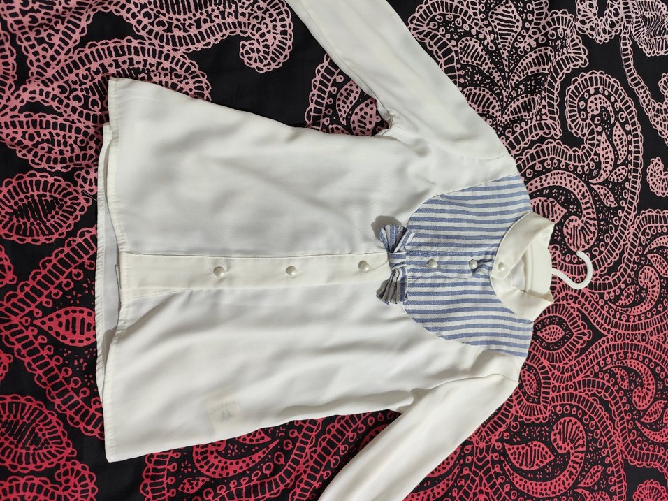 Beyaz, düğmeli ve yakalı, soft sentetik kumaştan yapılmış bohem tarzı kız gömlek. Çizgili yaka detayı ve nakışlı desen içerir. Günlük kullanım için uygundur.