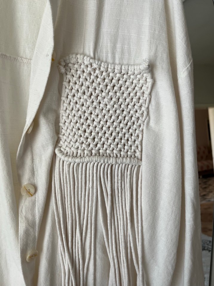 Düğmeli, nakış detaylı beyaz keten uzun ceket. Notlu yaka, geniş kesim ve askılı kollarla bohem tarzını yansıtır. Gömlektır bı tık kalın dır standarttr