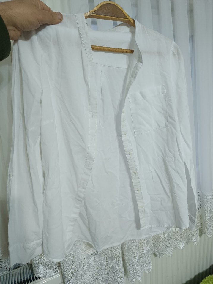 Bu beyaz pamuk gömlek, uzun kollu, V yaka ve düğmeli ön tasarıma sahiptir. Bol kesim ve midi boyda olup, minimalist bohem tarzındadır.