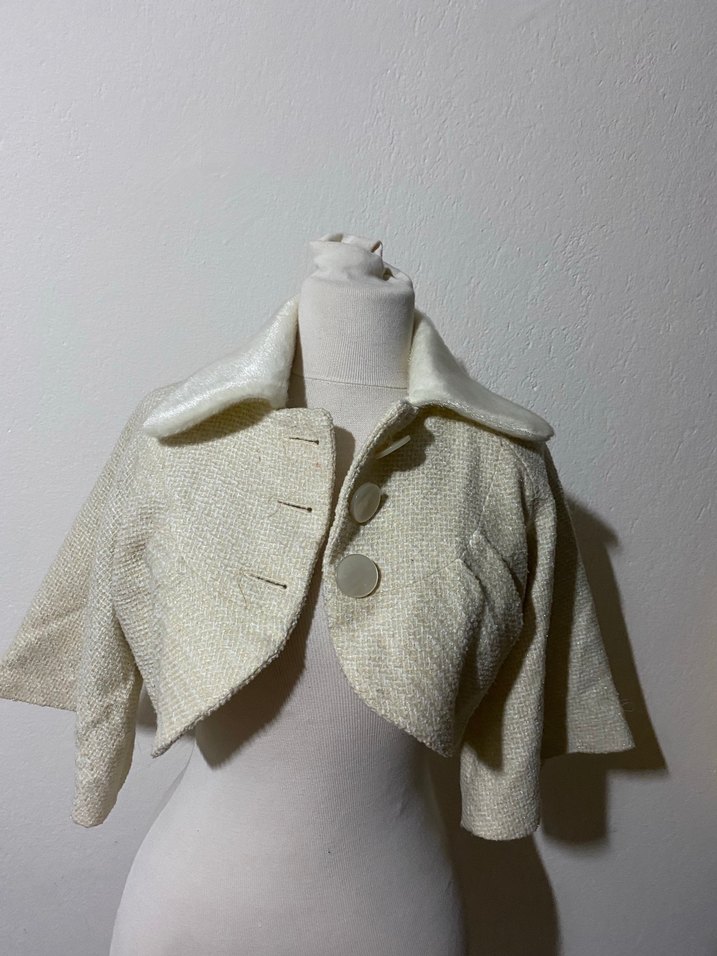 Düğmeli, yakalı ve beyaz renkte, sentetik kumaştan yapılmış, fitted kesim bolero. Kolsuz ve desensiz, modern klasik tarzda. ✨