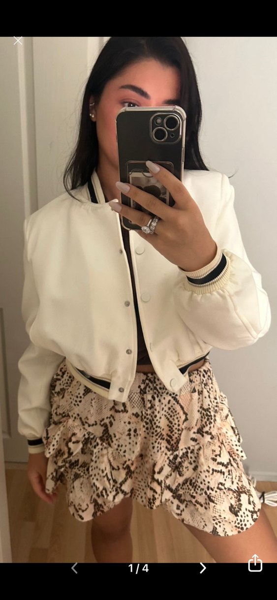 Bol kesim, kısa beyaz deri ceket uzun kollu ve düğmeli. Bisiklet yaka ve yılan deseni detaylı, günlük kullanıma uygun. Marka temsili