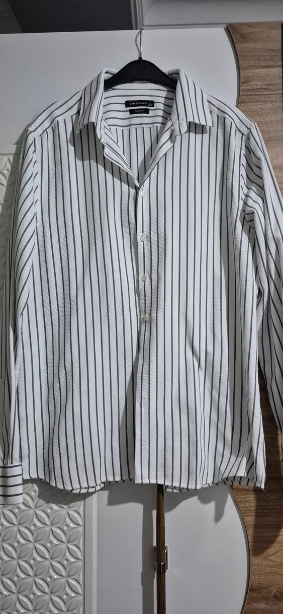 Düğmeli, uzun kollu, yakalı ve regular fit olan bu erkek keten gömlek, beyaz zemin üzerinde gri çizgilerle ofis ve günlük kullanım için uygundur.