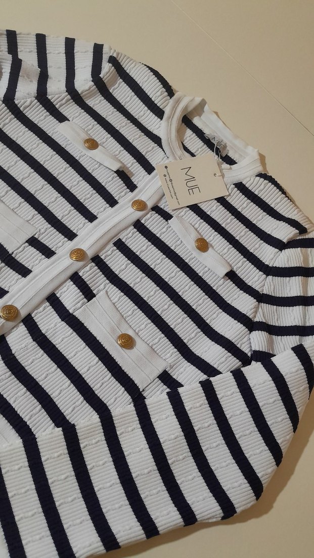 Kadınlar için uzun kollu, kayık yaka ve düğmeli beyaz-gri çizgili hırka Normal kesim ve kısa boyuyla günlük rahat stil için uygundur.
