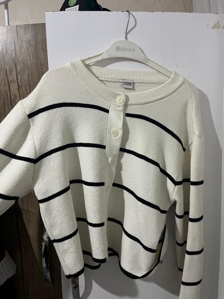 Beyaz renkli, siyah yatay çizgili düğmeli örme kadın hırka. Uzun kollu, yuvarlak yakalı, bol kesim ve midi boyda, günlük sokak stiline uygun.