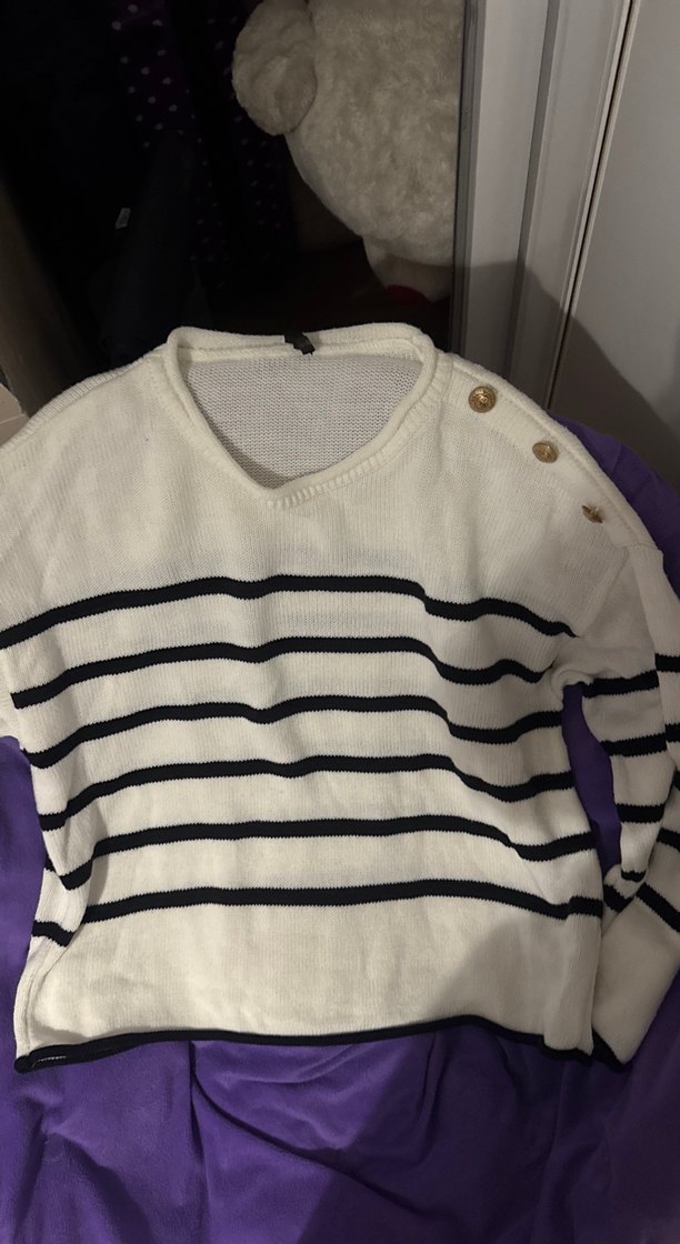 Pamuklu, uzun kollu, yuvarlak yaka beyaz kazak. Omuzda düğme detaylı, bol kesim ve siyah yatay çizgilidir. Günlük sokak modasına uygun. Geniş bir kalıptır çok az giydim rahattır