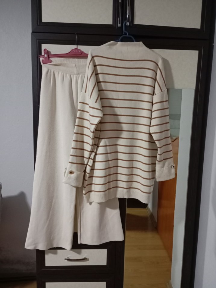 Düğmeli ve çizgili, bol kesim uzun kollu beyaz triko, pamuklu hafif kumaş pantolonla kombine edilmiştir. Rahat ve günlük kullanım için uygundur.