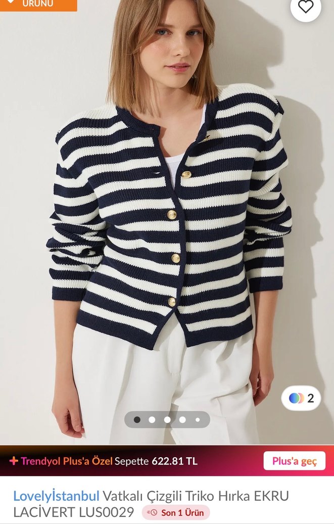 Beyaz renkli, lacivert çizgili, uzun kollu, düğmeli, kısa ve bol kesim triko hırka. Günlük kullanıma uygun rahat bir model.